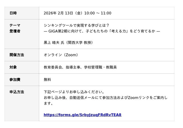 教育委員会向けオンラインセミナーシリーズ「Next GIGA語ろう!2026」第4回では、関西大学教授の黒上 晴夫氏をゲストに迎え、シンキングツールを「どう使うか」ではなく、「なぜ使うのか」という視点から捉え直します。思考スキルの理論的背景を整理しながら、教室・学校・自治体に「思考する文化」をどのように根付かせていくのか、実践事例を交えてご紹介いただきます。