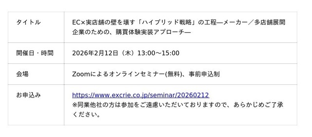 株式会社クロス・マーケティンググループのグループ会社でソーシャル&セールスプロモーションサービスを展開する株式会社エクスクリエ(本社:東京都新宿区、代表取締役社長:小笠原 亨)は、2026年2月12日(木)に、ECと実店舗の相乗効果を最大化させるための戦略設計をテーマにしたオンラインセミナー「EC×実店舗の壁を壊す『ハイブリッド戦略』の工程 ―メーカー/多店舗展開企業のための、購買体験実装アプローチ―」を開催いたします。