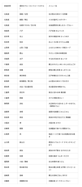 提供ホテル:コンフォートホテル秋田、郡山、前橋、東京神田、新潟駅前/燕三条、奈良、堺、姫路、呉、新山口、高知、熊本新市街、那覇県庁前