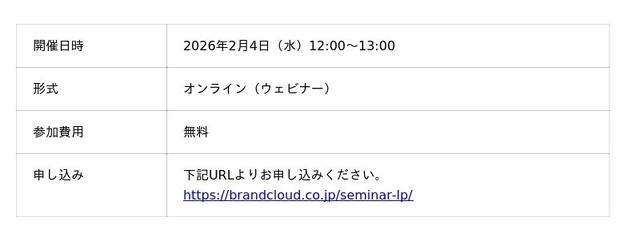 ビジネスコーチ株式会社(本社:東京都港区、代表取締役社長:細川 馨、東証グロース:9562)の子会社であるコーポレートコーチ株式会社(本社:東京都港区、代表取締役社長:森川 駿、以下当社)は2月4日(水)に、株式会社ブランドクラウドと共催セミナーを開催いたします。