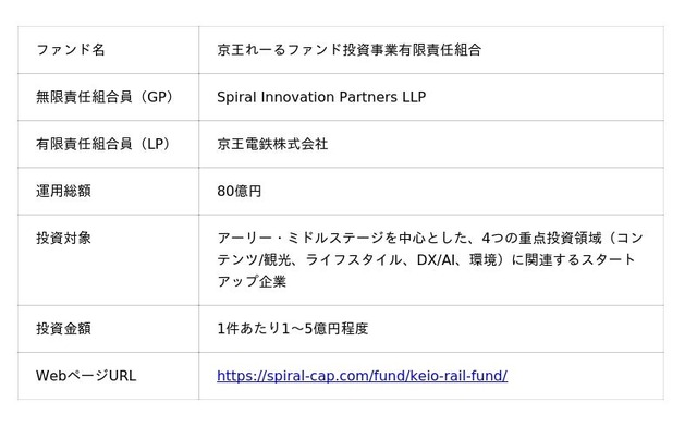 Spiral Innovation Partners株式会社(Spiral Capital株式会社〔本社:東京都港区、ジェネラルパートナー兼CEO 奥野 友和〕の子会社、以下「SIP」)は、傘下のSpiral Innovation Partners LLPを通じて、京王電鉄株式会社(本社:東京都多摩市、代表取締役社長 都村 智史、以下「京王電鉄」)と共同で、80億円規模のCVCファンド「京王れーるファンド投資事業有限責任組合(以下「京王れーるファンド」)を2026年2月1日に組成しました。