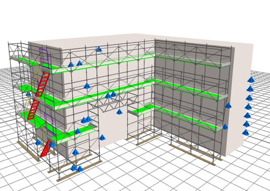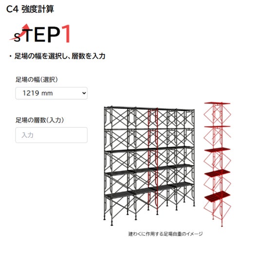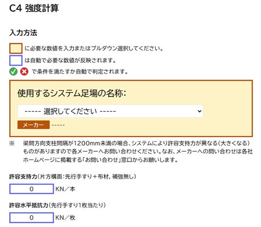 - 強度計算システム:部材数量等を入力すると自動で強度計算を行います(手すり先行システム足場に関しては、片側構面・先行手すり設置の基本的な場合のみを示しています)。