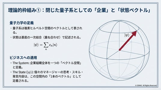 個々のマネージャーのインタビューやビジョンを「状態ベクトル」として扱い、組織全体を一つの巨大な「ヒルベルト空間(ベクトル空間)」として定義します。