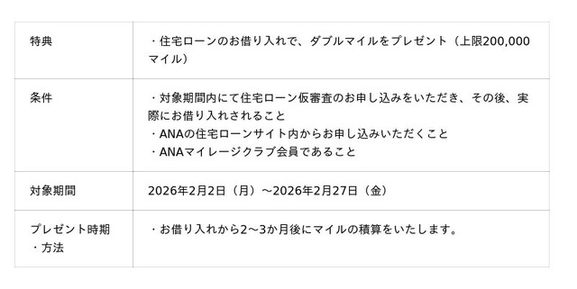 この度、2026年2月2日(月)より、「ANAの住宅ローン」ダブルマイルキャンペーン(以下、本キャンペーン)を実施いたします。