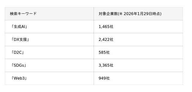 営業支援ツール「FutureSearch」は、週次で企業データベースを更新しているため、こうした最新の「バズワード」をいち早くキャッチアップします。企業サイトに掲載された最新のキーワードを取り込むことで、従来のセグメントでは難しかった「今、特定の課題に取り組んでいる企業」をダイレクトに絞り込むことが可能です。