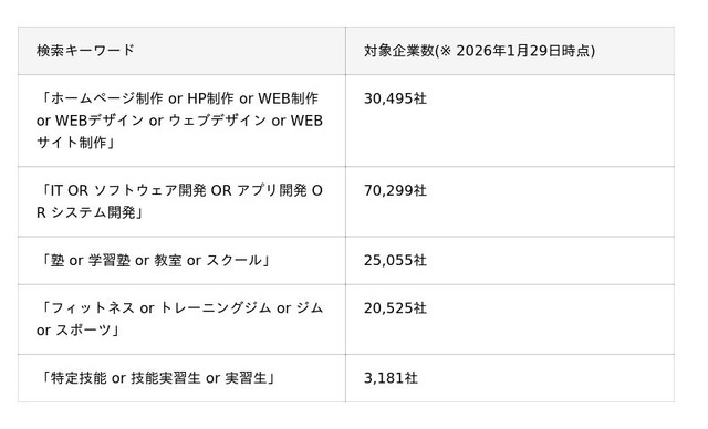 「FutureSearch」では、指定した複数のキーワードのいずれかを含む企業を抽出する「OR検索」に対応しています。既存の業種分類(日本標準産業分類など)では定義が難しい新しいビジネス領域や、企業によって異なる「表記揺れ」も、OR検索を組み合わせることで漏れなく網羅的なリストアップが可能となります。■ 実際に「FutureSearch」で使用されている「検索キーワード」