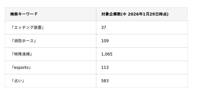 キーワード検索の最大の利点は、極めて専門性の高い商材や、ニッチな専門用語を扱う企業をダイレクトに特定できる点にあります。 標準的な業種カテゴリー(製造業、サービス業など)では絞り込みが困難な市場を狙い撃つことで、競合他社がまだアプローチしていない「ブルーオーシャン」へのアプローチが可能となり、商談化率の向上に直結します。■ 実際に「FutureSearch」で使用されている「検索キーワード」