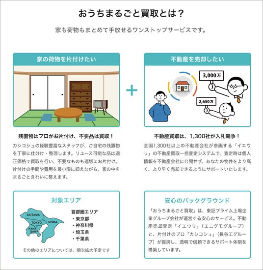 本サービスは、不動産売却と家財整理を一括で行えるワンストップサービスです。「イエウリ」が家・土地など不動産の買取査定を行うと同時に、「カシコシュ」が家具・家電・日用品・遺品などの動産について、お片付け・処分・買取を含めた見積もりを実施します。複数の業者へ個別に依頼する必要がなく、窓口ひとつで住まいと家の中のものをまとめて手放すことができるため、空き家や相続物件などの売却に伴う手間や精神的負担を大幅に軽減します。
