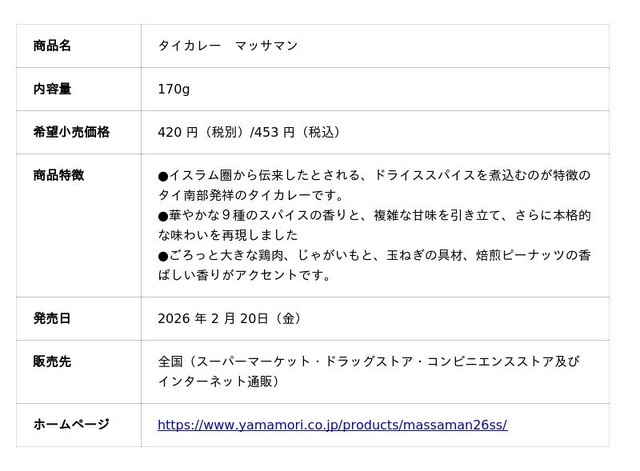 総合食品メーカー、ヤマモリ株式会社(本社:三重県桑名市、社長:三林 圭介)は、ご家庭で本格的なタイの味が楽しめるヤマモリ タイカレーシリーズの主力商品「タイカレー マッサマン」をリニューアルし、2026年2月20日(金)より発売します。