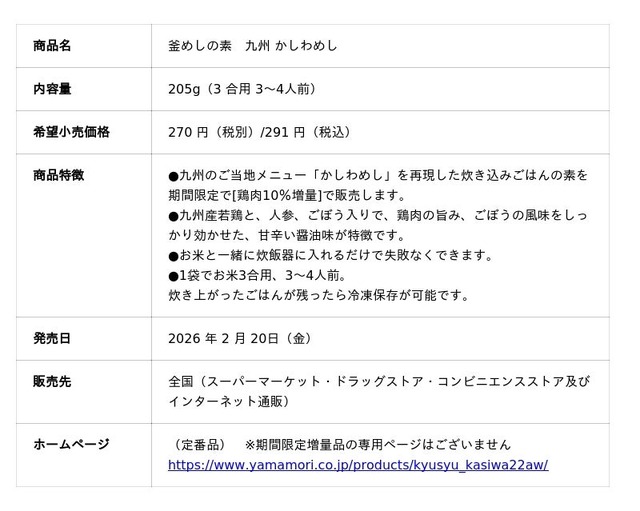 総合食品メーカー、ヤマモリ株式会社(本社:三重県桑名市、社長:三林 圭介)は、好評販売中の釜めしの素「九州 かしわめし」の具を2026年2月20日(金)より期間限定で10%増量して販売します。釜めしの素は、初めてお料理をする方でも失敗なくおいしく作れるので新生活を迎える方にはぴったりです。