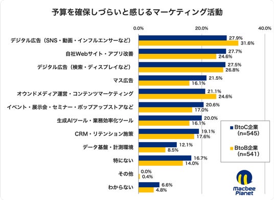 さらに、「社内で予算を確保しづらいマーケティング活動」では、BtoB企業は“デジタル広告(SNS・オンライン動画・インフルエンサー施策など)”(31.6%)が最多。BtoC企業は“マス広告”(21.5%)をはじめ、“生成AIツール・業務効率化ツール”(20.0%)や“データ基盤・計測環境”(12.1%)がBtoB企業より高く、“必要だが通しづらい”投資テーマがにじみ出る結果となりました。