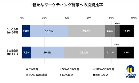 また、新規施策・新技術導入など「新たに実施する取り組み」への投資比率は、BtoC企業で「50%以上」(4.4%)がBtoB企業(0.6%)を上回りました。BtoC企業は拡大局面の中で、新規投資に振り向ける余地が相対的に大きい傾向が見られます。