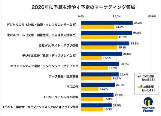 「すべてのマーケティングを成果報酬に」を掲げる株式会社Macbee Planet(本社所在地:東京都渋谷区、代表取締役社長:千葉 知裕)は、企業でマーケティング業務に従事する担当者1,086名を対象に「投資シフトマップ調査」を実施しました。2025年から2026年にかけて、どの領域の予算を「増やす/維持する/削る」のかを可視化し、とりわけBtoB企業とBtoC企業の違いに着目して分析しています。本調査では、1.予算全体の見通し、2.領域別の投資意向、3.投資判断の観点や運用実態を横断的に捉えることで、「増やしたい領域」と「確保の難しさ」のギャップ、そして成果が出にくい領域の“見直し圧力”に注目しました。