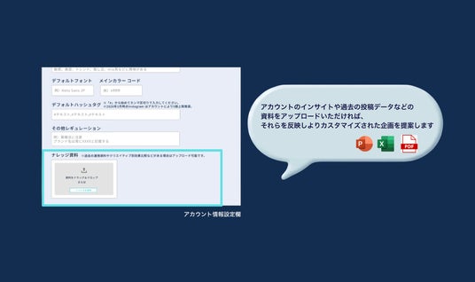 3. 分析資料の反映による「パーソナライズ企画」の生成アカウント独自のインサイトデータや過去の運用資料をアップロードすることで、