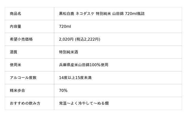 白鹿ブランドを展開する辰馬本家酒造株式会社(本社:兵庫県西宮市、代表取締役社長:辰馬清)は、2022年の発売から毎年ご好評をいただいている、商品を購入することで地域貢献に参加できる日本酒『黒松白鹿 ネコダスケ 特別純米 山田錦』 〈720ml瓶/2,020円(税込2,222円)〉を数量限定で2026年2月13日(金)に直営店『白鹿クラシックス』、ECサイト『白鹿オンラインショップ』にて発売いたします。