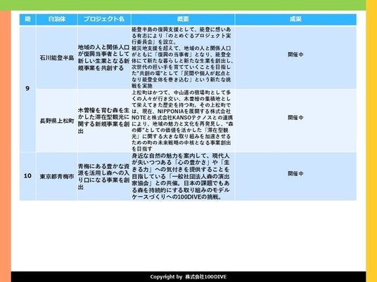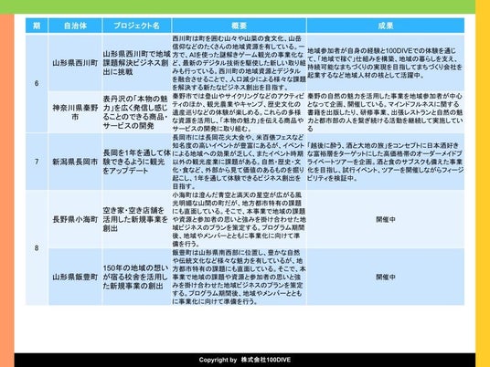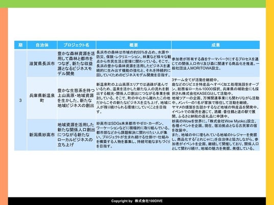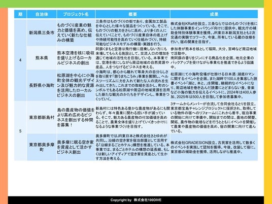 100DIVEでは、2021年から10期22の地域で実施し、341名が参加。30チームが活動を継続し、8つの事業が法人化を実現しています。地域やチームごとの取り組み内容、事業化の進捗なども含めて、”100DIVEのこれまで”を下記の画像にまとめております。