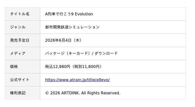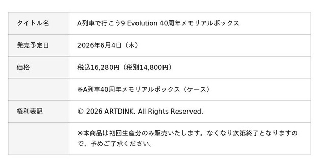 株式会社アートディンクは、Nintendo Switch(TM) 2にて「A列車で行こう9 Evolution」を2026年6月4日(木)に発売することを発表いたしました。また、40周年を記念した豪華限定版の「A列車で行こう9 Evolution 40周年メモリアルボックス」が同日発売されることも発表いたしました。