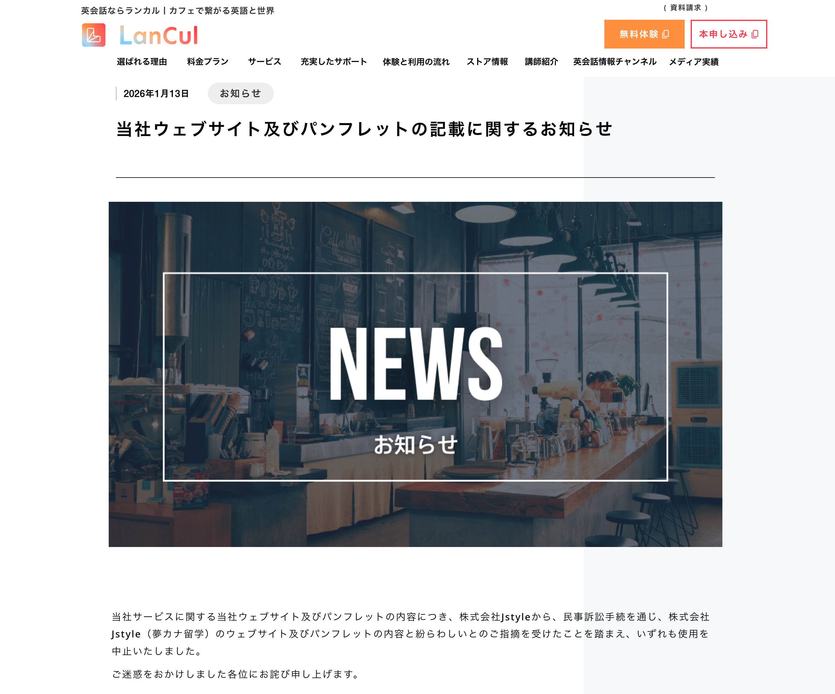 当社(株式会社Jstyle、代表取締役:安藤 和隆)は、LanCul株式会社(代表取締役:阪野 思遠)を被告として、損害賠償等を請求する民事訴訟を提起しておりましたが、この度、同社より下記URLのとおり謝罪の申入れがありました。