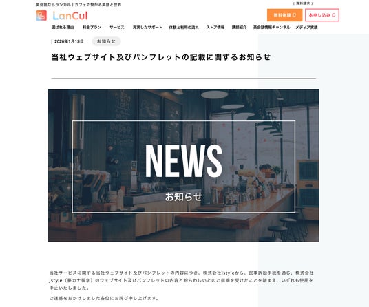 本件は、LanCul株式会社(提供サービス:LanCul英会話 及び LanCul留学)が集客活動において使用していたランディングページ及びパンフレット等において、当社著作物と類似する表現が確認されたことを受け、当社として対応を進めていたものです。その後の協議の結果、両社間で訴訟上の和解が成立し、本件訴訟は終了いたしましたので、ご報告いたします。