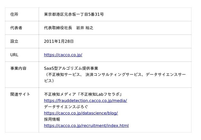 Caccoは、「未来のゲームチェンジャーの『まずやってみよう』をカタチに」という経営ビジョンを掲げ、セキュリティ・ペイメント・データサイエンス技術をもとに、アルゴリズム及びソフトウエアを開発・提供し企業の課題解決やチャレンジを支援することを目指しております。 オンライン取引における「不正検知サービス」を中核サービスとして位置づけ、不正ログインから不正注文対策まで対応可能な国内での導入実績数No.1の不正検知サービス「O-PLUX」や金融機関や会員サイトにおける情報漏洩対策の不正アクセス検知サービス「O-MOTION」、フィッシング対策サービス等を提供しております。
