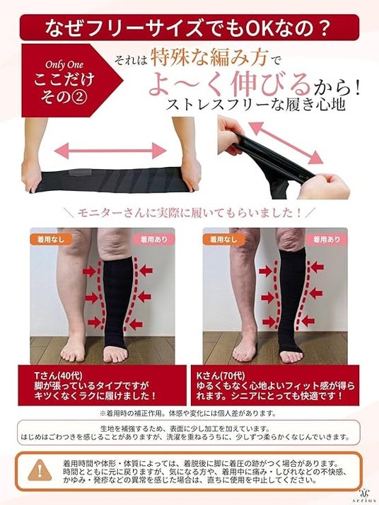 まるでコルセットのように履く人の脚の形に合わせてフィットするため、あえて「フリーサイズ」のみで販売することにしました。モニターテストでも「どんなサイズにも合うのが不思議」と驚きの声があがりました。