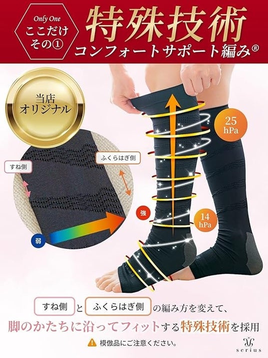 1. 独自技術「コンフォートサポート編み(※意匠出願済み)」日本国内では他にない(※自社調べ)特殊な編み技術を採用。すね側(幅約1cm)とふくらはぎ側(幅数cm)で編み方の幅を変えることで、肉付きの少ないすねへの圧迫を逃がし、ふくらはぎを最適にサポートします。この構造が「締め付けがきつくないのにスッキリする」秘訣です。