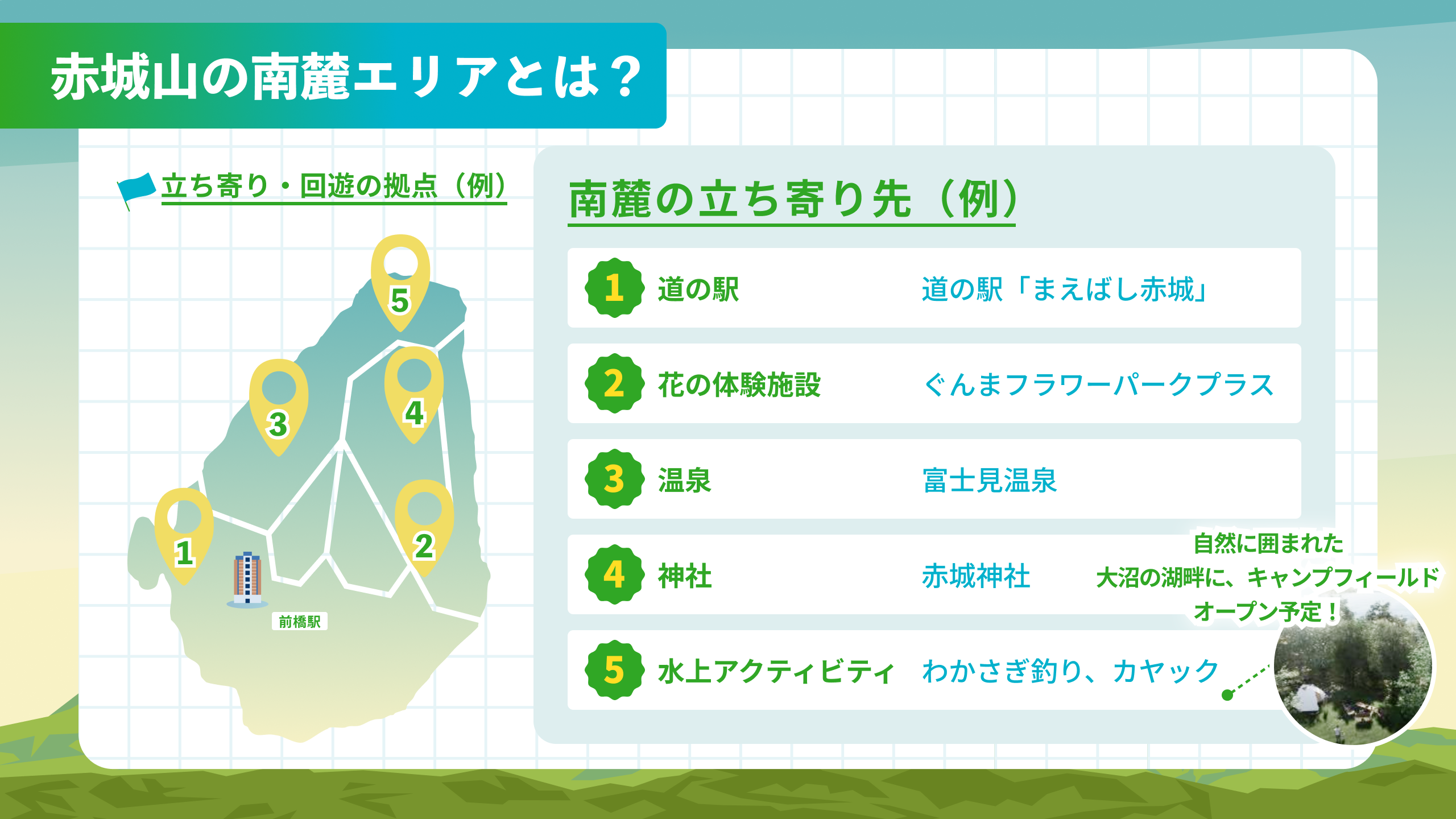 群馬県の県庁所在地である前橋市は、首都圏から約1時間半というアクセスの良さと、赤城山をはじめとする豊かな自然が共存するまちです。赤城山は古くからの信仰の対象であり、四季折々の自然やアクティビティなど、多様な魅力を持っています。南麓では2025年10月に「ぐんまフラワーパークプラス」がオープンし、山頂エリアでは2026年春に「キャンプフィールド」や「ほぼの駅 AKAGI」、秋以降には新たなビジターセンターの開業などが予定されています。