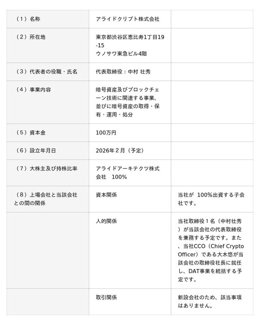 加えて、当社は暗号資産の保管・運用体制の強化を目的として、日本国内に新たに子会社「アライドクリプト株式会社」を設立することを決定いたしました。今後は既存のシンガポール法人Allied Verse Pte. Ltd.と連携し、事業環境の優位性を踏まえたグローバルな運用体制を構築することで、機動的かつ効率的な暗号資産運用を目指します。