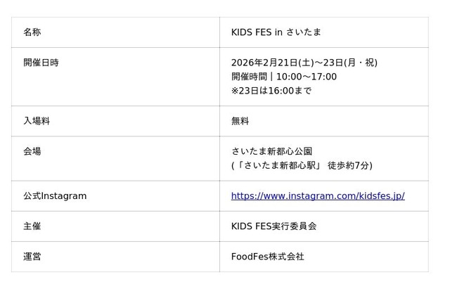 FoodFes株式会社(代表取締役:稲垣一馬)は、2026年2月21日(土)から23日(月・祝)までの3日間、さいたま新都心公園(埼玉県さいたま市)にて、子ども向け体験型イベント「KIDS FES in さいたま」を開催いたします。