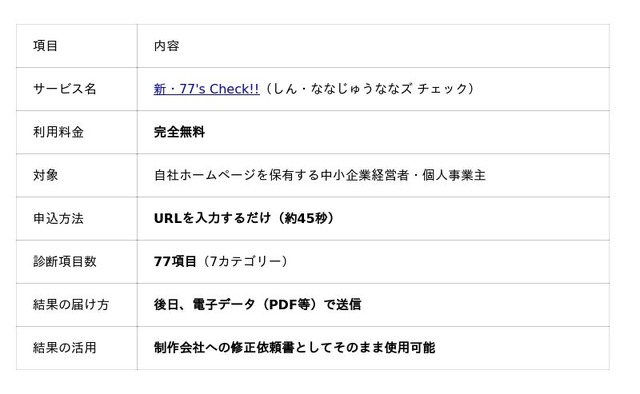 株式会社ガーディアン(本社:東京都中央区京橋3-9-5/代表取締役社長:青山裕一)は、日本全国の中小企業経営者・個人事業主を対象に、無料ホームページ診断サービス『新・77's Check!!』の提供を開始いたします。
