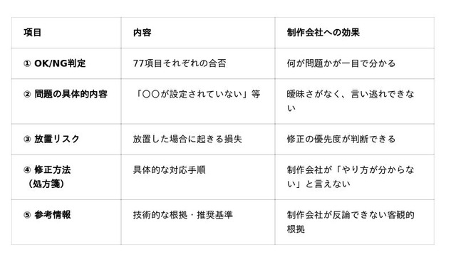 『新・77's Check!!』の診断結果レポートは、制作会社にそのまま渡して「これを直してください」と依頼できる資料として設計されています。