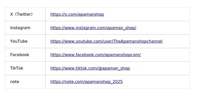 Tel: 0570-058-889 Mail: pr@apamanshop.co.jp