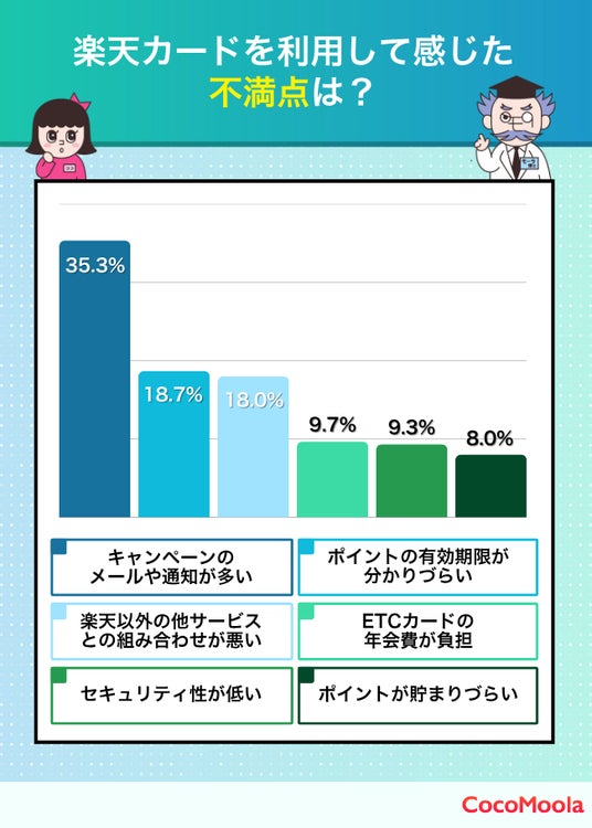 - 反対に、楽天カードを利用して感じた不満点TOP3は「キャンペーンのメールや通知が多い」「ポイントの有効期限が分かりづらい」「楽天以外の他サービスとの組み合わせが悪い」。