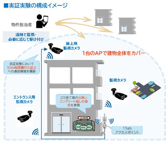 今回の実証実験においては、11ahのアクセスポイントを用いて管理対象のマンション全体をカバーする無線環境を構築し、複数台のカメラ設置により、建物の遠隔監視を実現しました。構築した無線環境およびカメラによって、不動産管理会社の業務効率化、および物件価値向上に資するか確認することを目的に実証実験を実施しました。