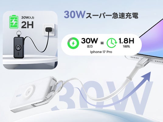 本製品は、外出先や移動中の使用を想定し、12000mAhの大容量、最大30Wの急速充電、USB Type-C巻き取り式ケーブル内蔵といった実用性を重視したモデルです。