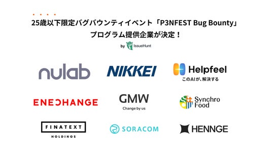 バグバウンティプログラム提供企業(敬称略): 株式会社日本経済新聞社/株式会社GMW/ENECHANGE株式会社/株式会社ヌーラボ/株式会社Helpfeel/HENNGE株式会社/株式会社ソラコム/株式会社Finatextホールディングス/株式会社シンクロ・フード