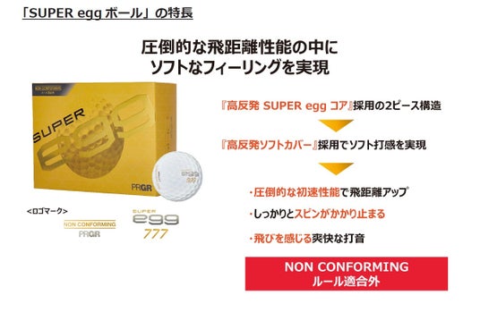 「SUPER eggボール」は、ルール適合モデルを大幅に超えた初速性能を発揮する「高反発 SUPER eggコア」と、従来品よりもソフトなフィーリングを可能にした「高反発ソフトカバー」の採用により、ルール適合外の圧倒的な飛距離性能とアプローチ時の安定したスピン性能の両立を実現しています。同時に発売する飛びの可能性を徹底追及した「SUPER eggドライバー」「SUPER eggフェアウェイウッド」「SUPER eggユーティリティ」と同様、ゴルフを生涯楽しみたい、とにかく飛ばしたいといったゴルファーのためのボールになっています。