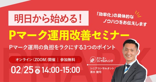 Pマーク、 ISOコンサルにおける支援実績 No.1(注1)のISO/Pマークの取得・運用支援サービス「認証パートナー」を提供する株式会社スリーエーコンサルティング(本社:大阪府大阪市、代表取締役社長:竹嶋 寛人)は、2/25(水)14:00-15:00「明日から始める!Pマーク運用改善セミナー ~ Pマーク運用の負担をラクにする3つのポイント~」を開催します。