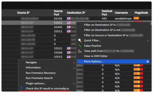 アナリストは QRadar のログ画面上に表示された IP アドレスを右クリックするだけで、詳細な Criminal IP の IP レポートを即座に参照できます。