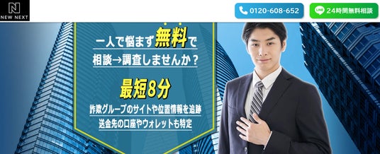 数多くの困難な案件を解決してきた専任の調査員が、親身になってお話を伺います。 あなたの未来を、これ以上誰にも奪わせないために。私たちは、最後まであなたの味方です。詐欺被害を最短8分で24時間無料調査|株式会社ニューネクスト【24時間無料相談】株式会社ニューネクストはロマンス詐欺、仮想通貨詐欺などの詐欺被害に対する24時間無料相談を行っております。新ホームページはこちらから→https://new-next.net/