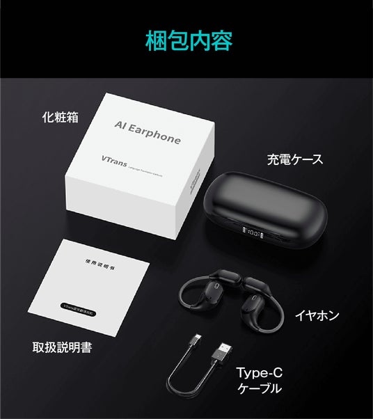 オープンイヤー型デザインで耳を塞がず、長時間でも快適に使いやすい設計です。イヤホン単体での翻訳利用で最大6時間、充電ケースで3回充電が行えるため、長時間利用時も使いたおせます。