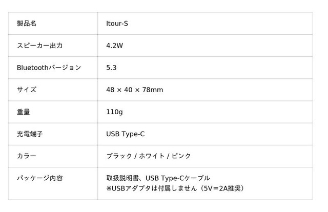 「Itour-S」は、48×40×78mm・110gという手のひらサイズながら、4.2W出力とパッシブラジエーターによる力強い低音を実現しました。