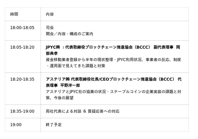 後半では、今後のステーブルコイン市場の展望や、注目すべき論点について、両社代表による対談形式で議論し、質疑応答を通じて参加者からの疑問にもお答えします。