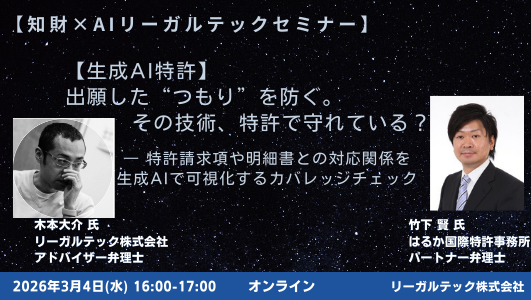 【知財×AIリーガルテックセミナー】では、リーガルテック株式会社が提供するAIツールなどをはじめ、ユーザー実務目線で情報をお届けします。