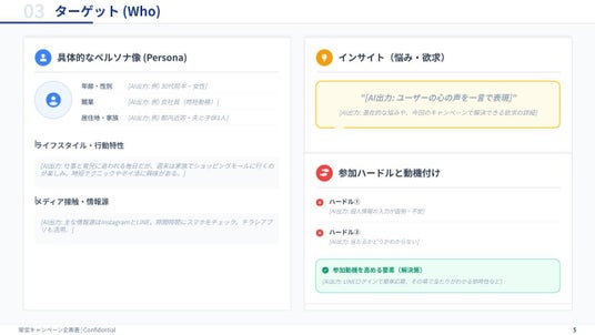特に、初めてキャンペーンを担当する方や、複数の案件を同時並行で進める多忙な担当者にとって、論理的で説得力のある企画書を短時間で作成することは大きな負担となっています。