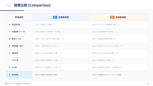 「拡散重視の施策」と「体験重視の施策」の2パターンを自動で比較提案し、意思決定をサポート