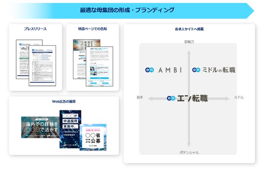 プレスリリースや特設ページ、Web広告での告知に加え、各求人サイトでの集客支援を実施。『ミドルの転職』『AMBI』『エン転職』とターゲットの異なる求人サイトを活用することで、ターゲットへ網羅的に求人を届けます。