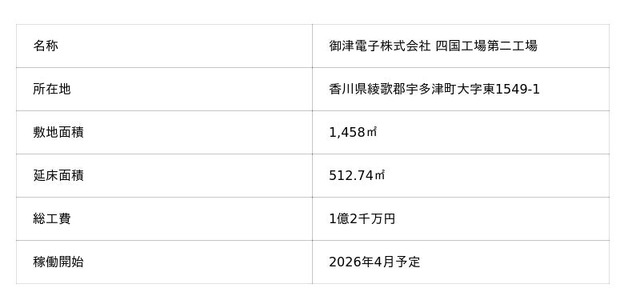 御津電子(株)(岡山)は、事業拡大および生産体制強化のため、香川県綾歌郡宇多津町に新たな生産拠点となる「四国第二工場」を竣工いたしました。