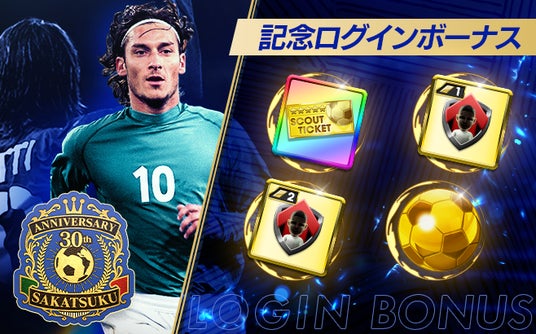 期間中のログインで、今回の“SAKATSUKU 30th Anniversary LEGEND SCOUT”にもラインナップされた「フランチェスコ・トッティ」などの選手たちの★4バージョンが合計で7人獲得できます。