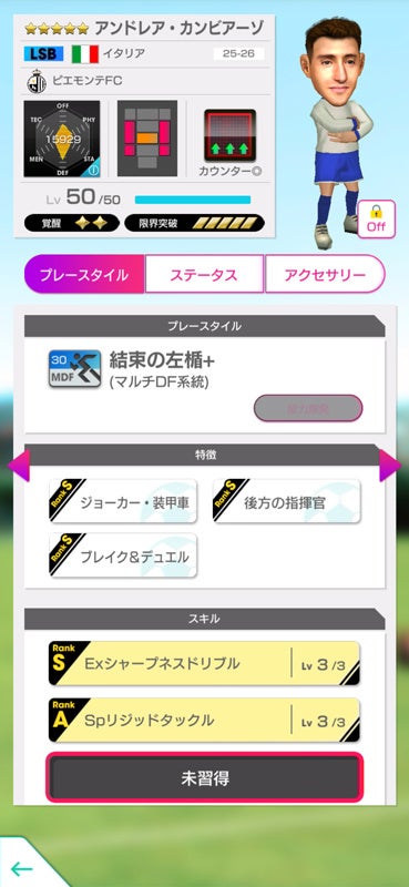 今回登場する「フランチェスコ・トッティ」は、同戦術の味方選手の精神力アップなどの追加効果を持った、新バンディエラ特徴「イル・プリンチペ」を所持しています。